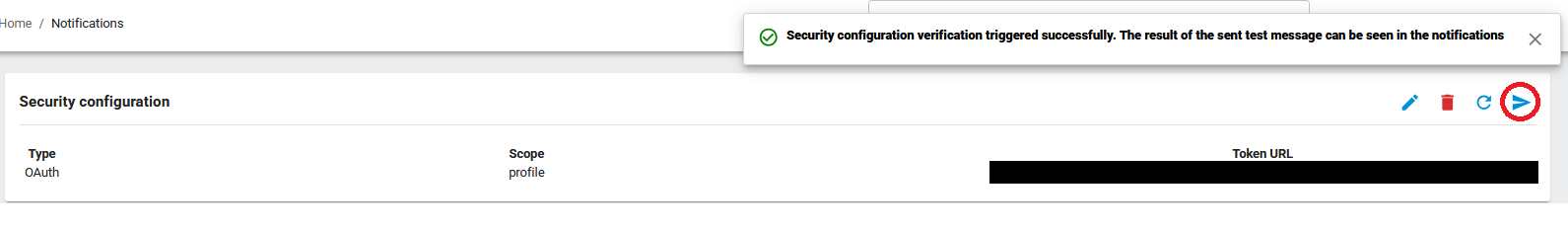 After completing your security configuration, you can verify that it’s working correctly. To do this, enable the "authentication.verification" notification, then go to the notification web portal and click the button in the top-right corner. This action will trigger a technical notification using your newly configured authentication settings. Finally, check the notification log at the bottom of the page to confirm whether the process succeeded or if any errors occurred.